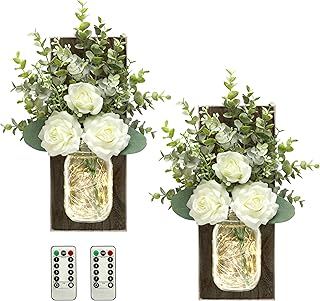 TenXVI Designs リモコン付きメイソンジャー燭台 バラとユーカリ付き 2個セット 素朴な農家 ボーホー カントリーウエスタンホームウォールデコレーション ダイニングルーム リビングルーム 寝室用 ブラウン