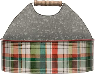 Creative Co-op 格子柄 3コンパートメント & 木製ハンドル メタルコンテナ グリーン