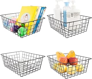 Vtopmart ワイヤー収納バスケット 整理用 4個パック メタルワイヤー 冷凍庫 オーガナイザー ビン ハンドル付き 大きなパントリーバスケット キッチンキャビネット バスルーム ランドリー ガレージ ブラック