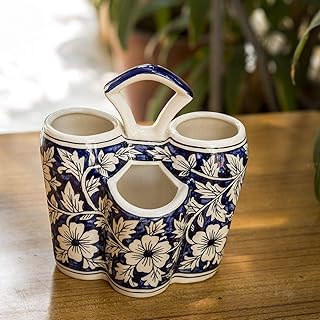 Craftghar Handmade Ceramic Spoon Stand Holder Tooth Brush Pan Stand in Vintage Handmade Blue Pottery Hand Painted, Cutlery Organizer Holder, 7 Inch, Blue