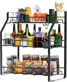 スパイスラックオーガナイザー カウンタートップ用 2段カウンタートップオーガナイザー キッチン/バスルーム/パントリー用 スーパーワイドスタンドスパイスオーガナイザーストレージシェルフ フック3個付き