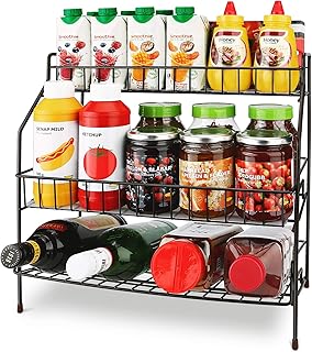 Ambuker スパイスラックオーガナイザー 3段折りたたみ式スタンドシェルフ キッチンキャビネットまたはカウンタートップ用 取り外し可能なフック2個付き