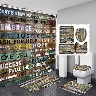 mamrug ブラウンシャワーカーテンセット 4点 インスピレーショナルな引用句 ノンスリップラグとトイレの蓋カバー カラフルな文章 木製ストライプ バス装飾 72インチ x 72インチ フック12個付き 丈夫 防水 バスルーム用