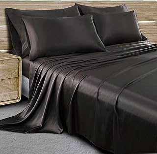 Pothuiny 6点 キングサテンシーツ ラグジュアリー シルキーブラック サテン 寝具セット ディープポケットボックスシーツ1枚 + フラットシーツ1枚 + 枕カバー4枚
