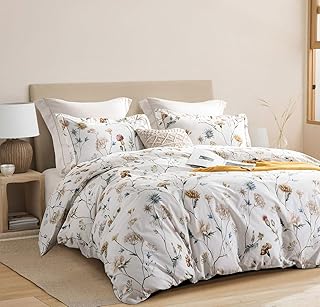 SLEEPBELLA 掛け布団カバー キングサイズ 黄&青の花 オフホワイトにプリント入り ゴールデンロッド刺繍フランジ付き コットン掛け布団カバー 3枚 掛け布団カバー1枚 (掛け布団の中身なし) 枕カバー2枚